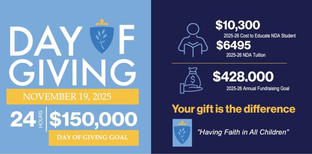 Day of Giving is our largest fundraiser that contributes to our 2025-2026 overall fundraising goal of $428,000. It is important that we meet this goal to keep tuition affordable and a Catholic education accessible to all.